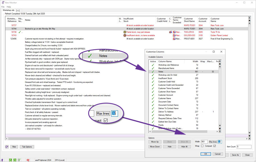 New Notes Column in Workshop Job Monitor