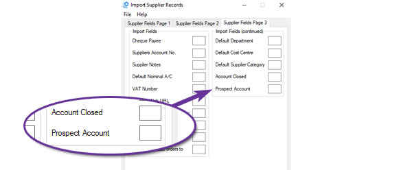 The Import Supplier Records function has been extended to allow new or existing supplier accounts to be flagged as Closed or Prospect. Two new fields have been added to the Supplier Fields Page 3 tab: