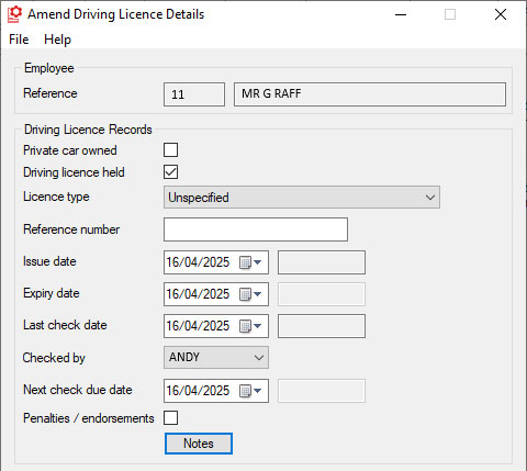 To assist with the HR task of maintaining records of employee’s driving licences, a new maintenance function is now available to allow the details to be updated without using the general Amend Employee Details function: