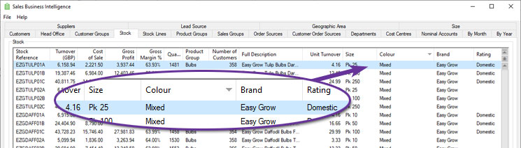 You can define up to ten custom attributes, such as size, colour, material, or any other classification relevant to your business, and now see this information against stock items listed within Sales Business Intelligence.