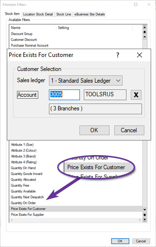 Two new filter options have been made added to all monitor tab types that can be filtered by Stock. The new filters, Price Exists For Customer and Price Exists For Supplier, allow you to enter an account number and view only stock items that have a matching price list entry. By combining this with other filters you could, for example, produce a monitor listing all of the items for which a specific customer has special pricing but which are not published to your website (and which they therefore could not purchase online).