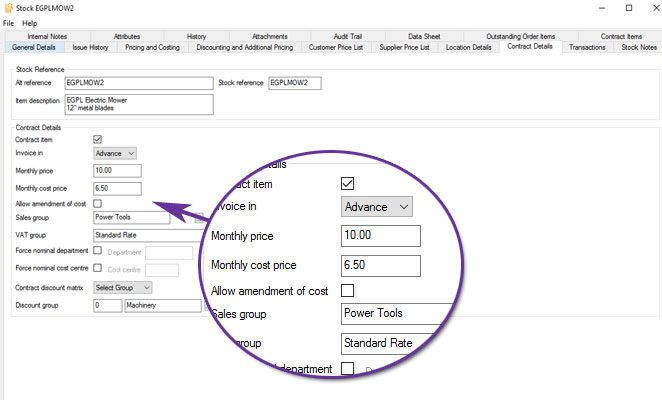 All service contract items will default to invoiced in advance. This may be amended from the Contract Details tab of the stock record or imported using Import Stock Details from CSV File.