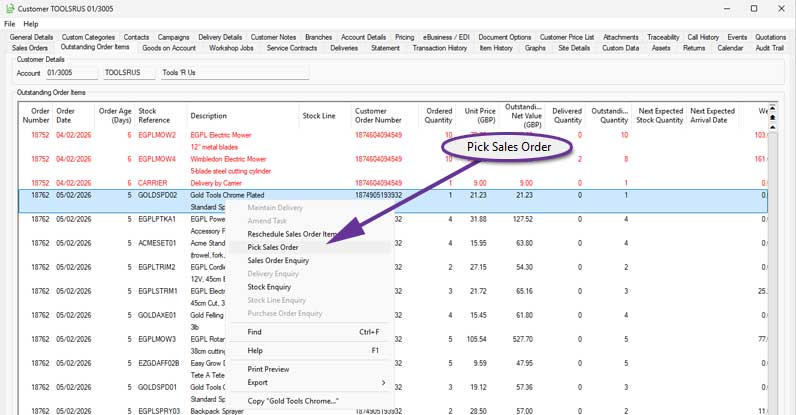 A new context menu (right-click) option has been added to make it easier to pick sales orders directly from Customer Enquiry. When you highlight an order on the Orders tab, or an individual line on the Outstanding Order Items tab, you can now use the new Pick Sales Order option.