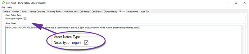 Customer Assets may have notes, which enable you to record any information that you wish against individual assets. This has been enhanced to allow the notes against specific assets to be marked as Urgent.